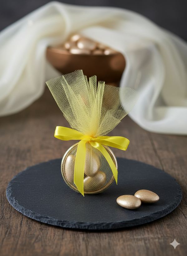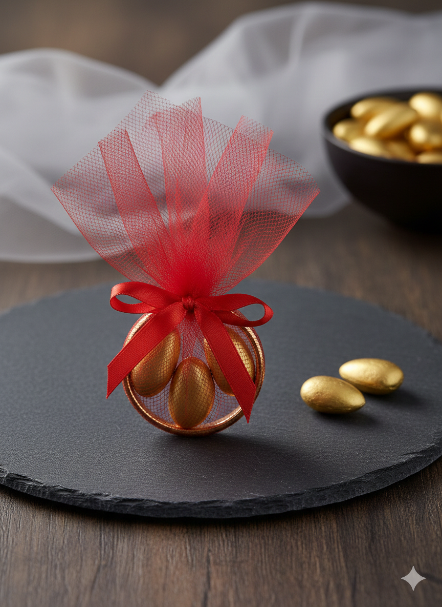 Maak van je speciale dag een blijvende herinnering met onze elegante handgemaakte gesuikerde amandelbedankjes. Deze klassieke traktatie, ook wel bekend als bruidssuikers, staat symbool voor geluk, gezondheid en voorspoed. Door de verfijnde afwerking met luxe metalen accenten zijn ze een sieraad op iedere feesttafel.